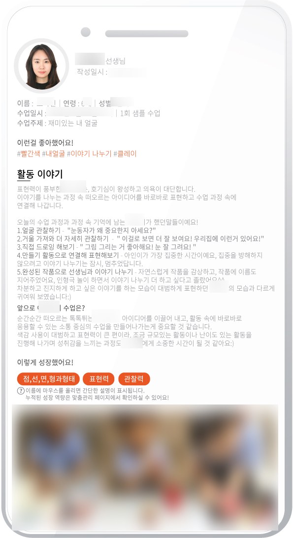 피드백에서는 오늘 활동 과정에서 아이가 보여준 다양한 모습을 기록해요. 맞춤 관리 보고서에는 이러한 모습을 토대로 앞으로의 수업이 어떻게 진행될지에 대한 계획이 담겨있어요. 부모님은 이러한 피드백을 통해 우리 아이의 숨겨진 면을 확인할 수 있죠.