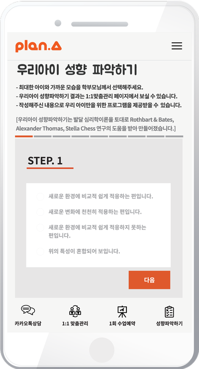 총 9-10가지의 질문이 준비돼있어요. 부모님이 우리 아이와 가장 가까운 모습의 항목을 선택해주면, 아이의 성향 테스트 결과를 받아 볼 수 있답니다. 그리고 플랜에이는 성향 테스트 결과를 토대로 우리 아이에게 맞는 수업 프로그램을 설계하기 시작해요. 물론 선생님 역시 아이의 성향 테스트 결과를 통해 매칭한답니다.