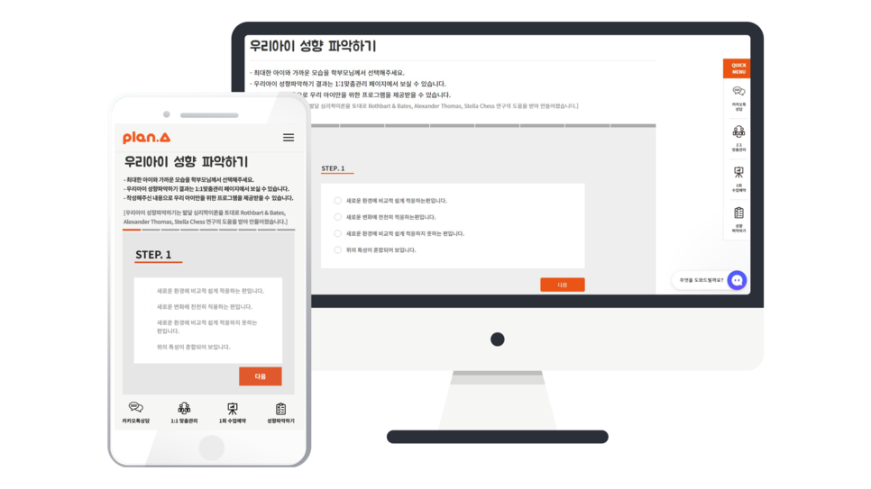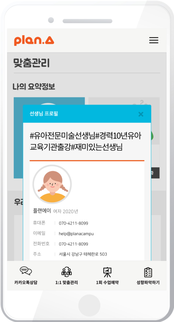 우리의 고민은 앞으로도 계속될 것입니다. 우리 아이가 자신을 누구보다 잘 이해하는 선생님을 만날 수 있을 때까지 플랜에이는 끊임없이 노력하겠습니다.