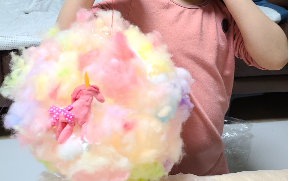 첫 수업으로 준비했던 주제는 ‘뭉게뭉게 솜사탕 구름’이었어요. 솜의 포근하고 부드러운 촉감을 탐색하고, 이를 통해 무드 등을 만들어보는 활동이에요.