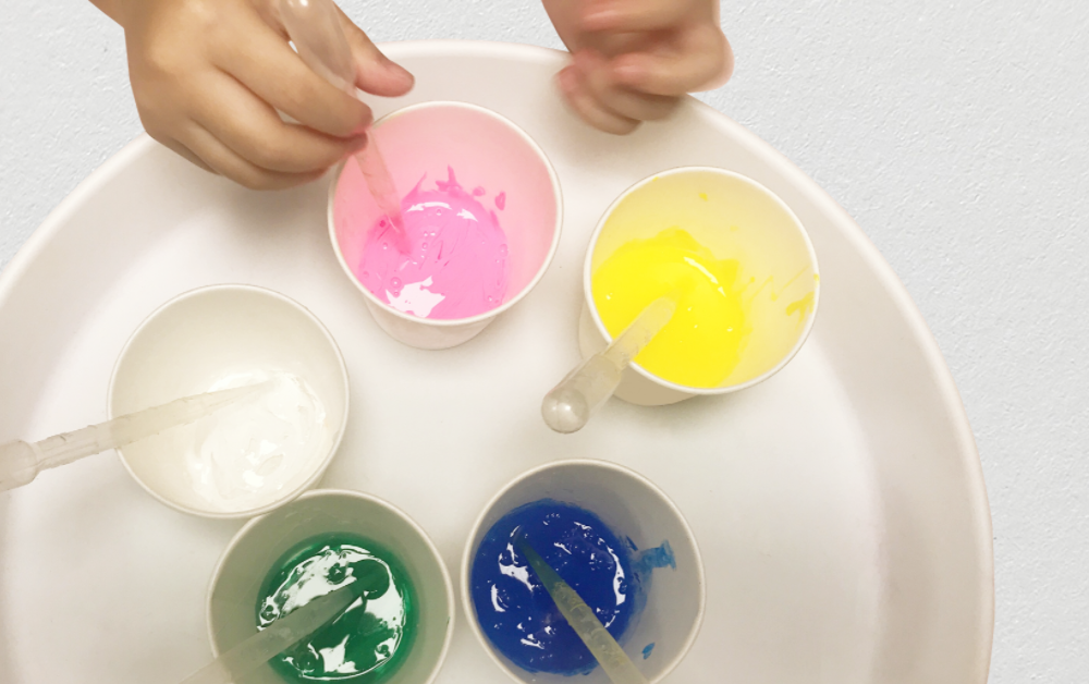 그래서 가장 첫 번째로 신경 쓴 부분은. 아이가 수업 도중 손에 묻는 것이 ‘사실은 아무렇지도 않은 거야’라고 생각할 수 있게 도와주는 것이었어요. 다음 두 가지 역시 그러한 목적으로 했던 방식이에요.