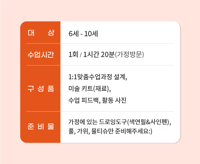 ‘과정’에 참가하는 선생님은, 미술을 매개로 우리 아이들과 함께 ‘소통’하고 싶어요. 기존의 일대다로 진행하는  클래스와는 달리, 선생님과 아이 1:1로 진행하는 프라이빗한 시간을 가질 거예요! 🙂