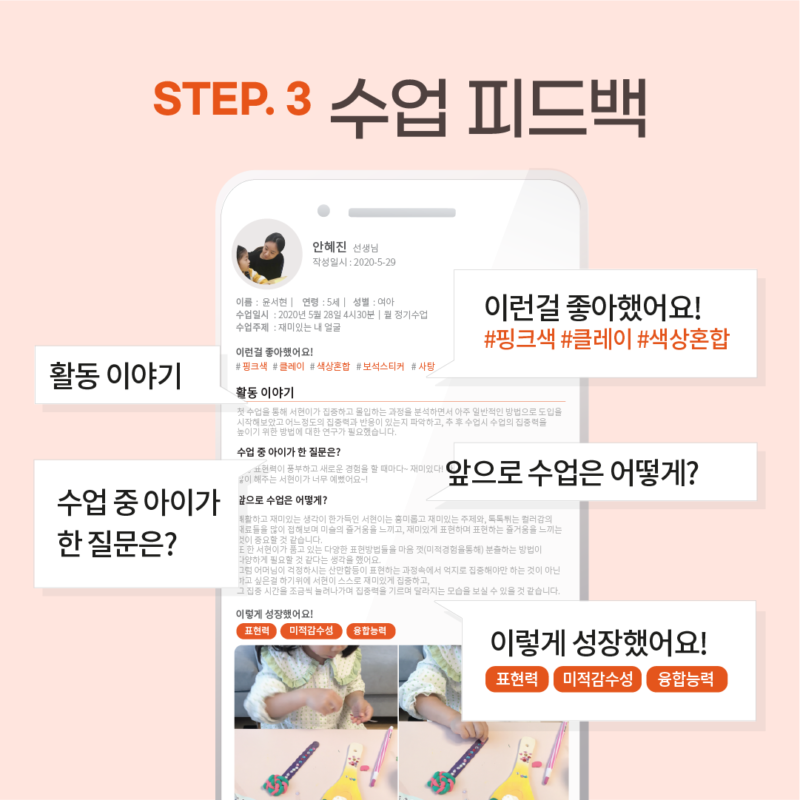 수업이 끝난 후 우리 아이가 어떤 생각의 흐름으로 ‘스스로’ 작품을 완성했는지, 자세한 수업 이야기가 담긴 피드백과 활동 사진을 부모님께 보내드려요.