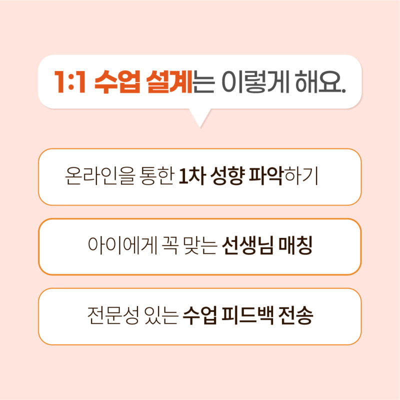아이 성향을 파악해, 우리 아이에게 맞는 1:1 맞춤 수업 방식을 설계해요.