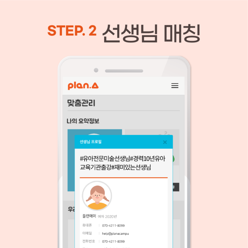 아이와 선생님의 성향을 꼼꼼히 비교해, 우리 아이에게 맞는 선생님을 매칭해요. 선생님이 매칭되면 모바일로 선생님 프로필을 확인 할 수 있어요!