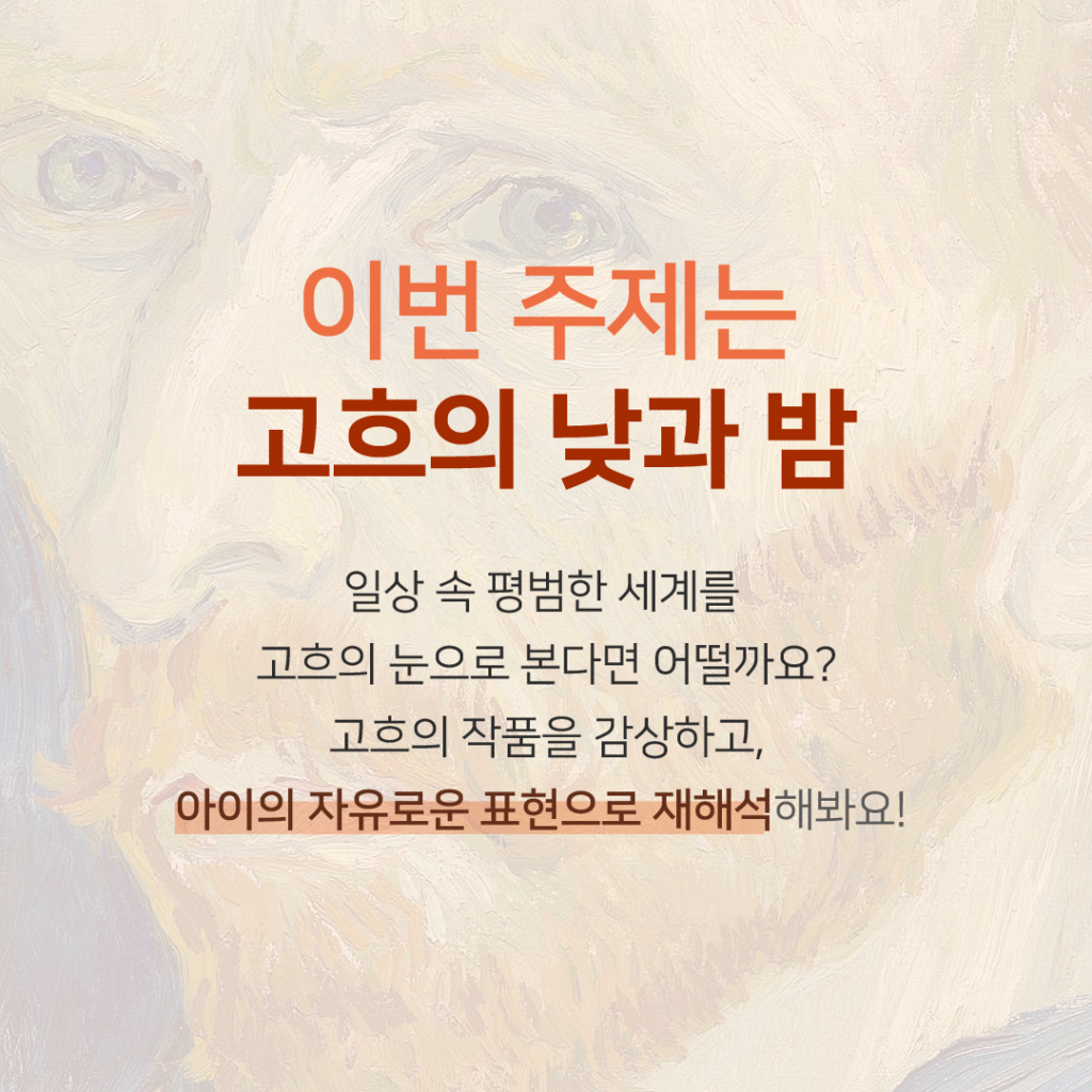 이 아저씨 이름은 무엇일까요? 고흐 아저씨는 뭐하는 사람 같아요? 맞아요! 그림을 아주 잘 그리는 화가 아저씨예요! 고흐 아저씨의 눈으로 본 하늘은 어떤 모습일지, 선생님과 작품을 통해 감상해볼까요? 🙂