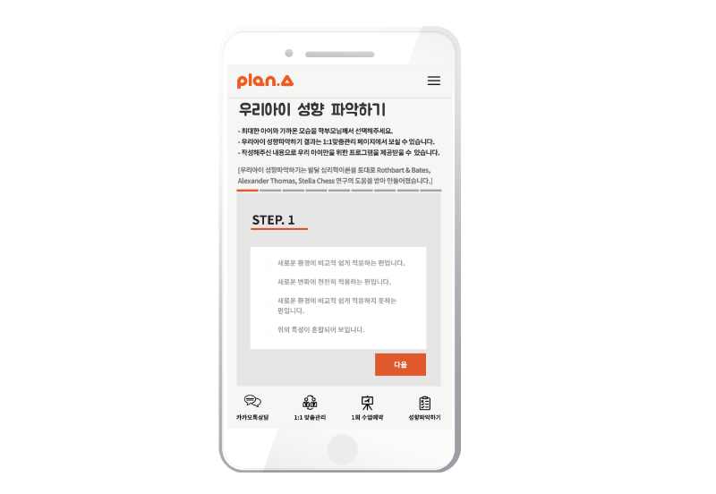 성향 파악 결과를 토대로 1회 수업을 시작했어요. 플랜에이 1회 수업은 아이와 많은 대화를 나누며, 앞으로 수업 설계를 위한 단계예요.