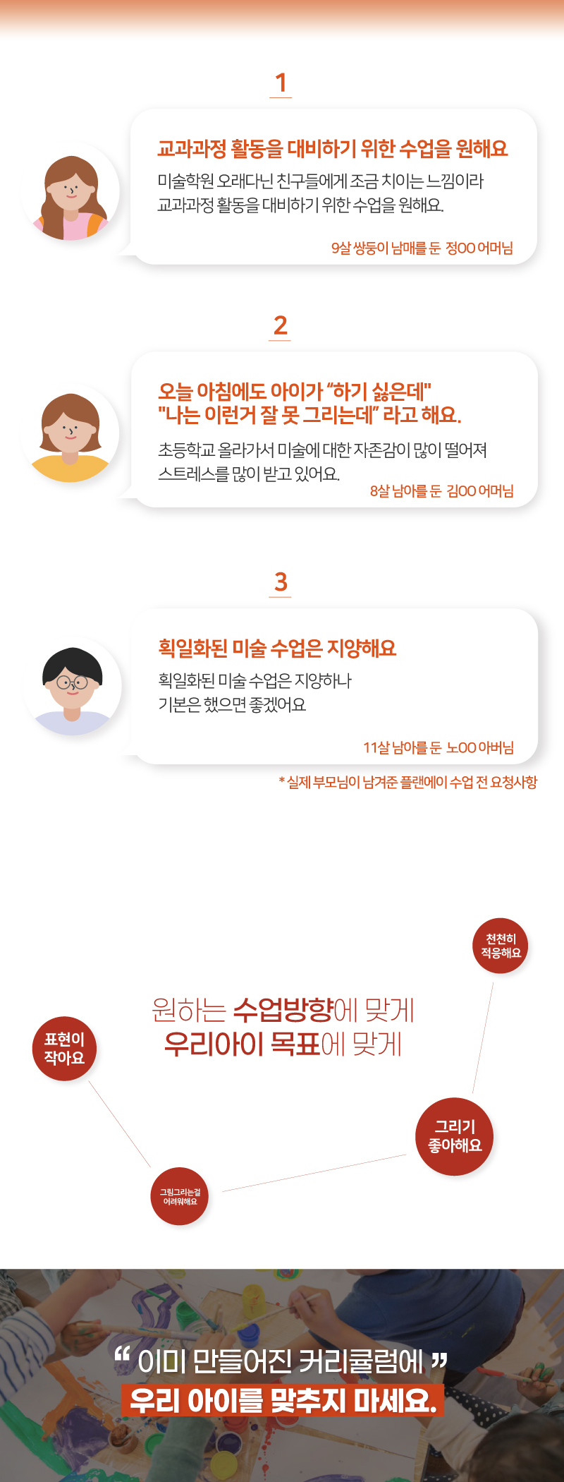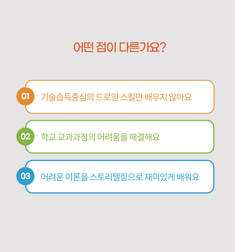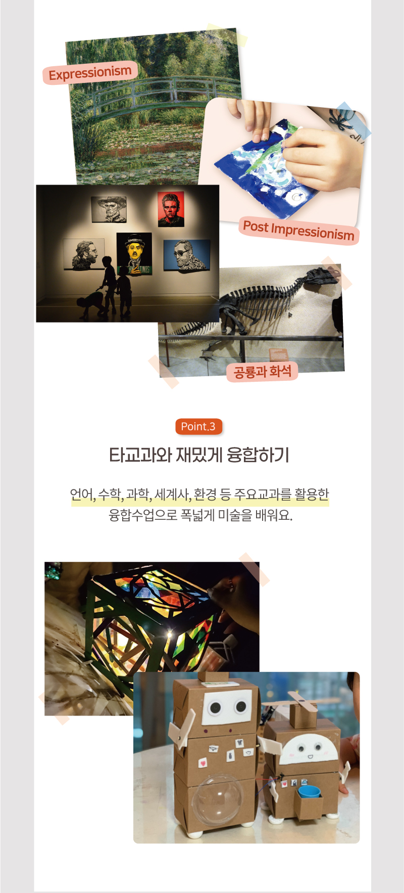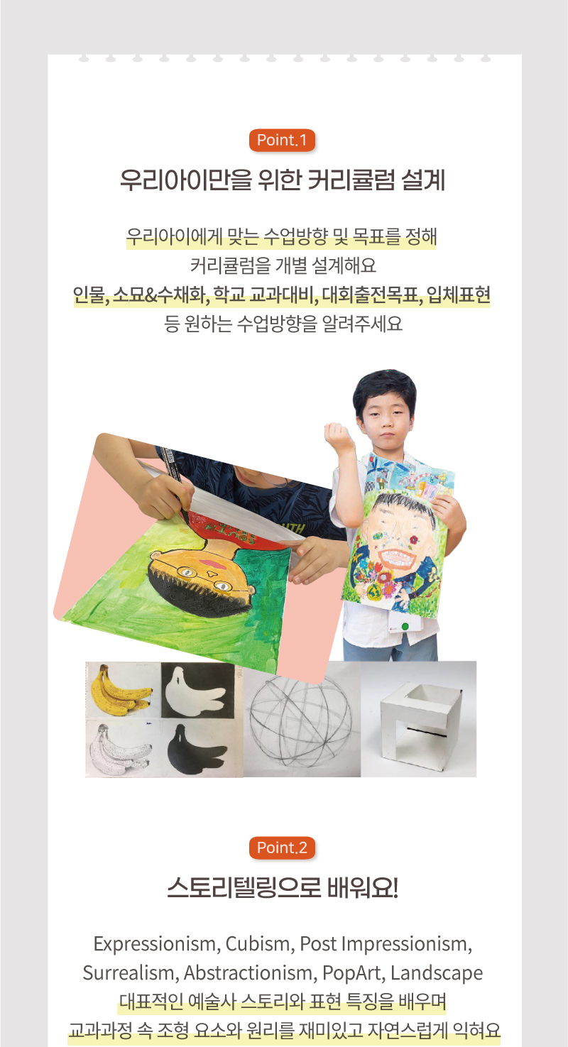 아이들이 학교 교과과정에 쉽게 적응 하고 미술의 원리와 방법을 재미있게 이해할 수 있습니다.
