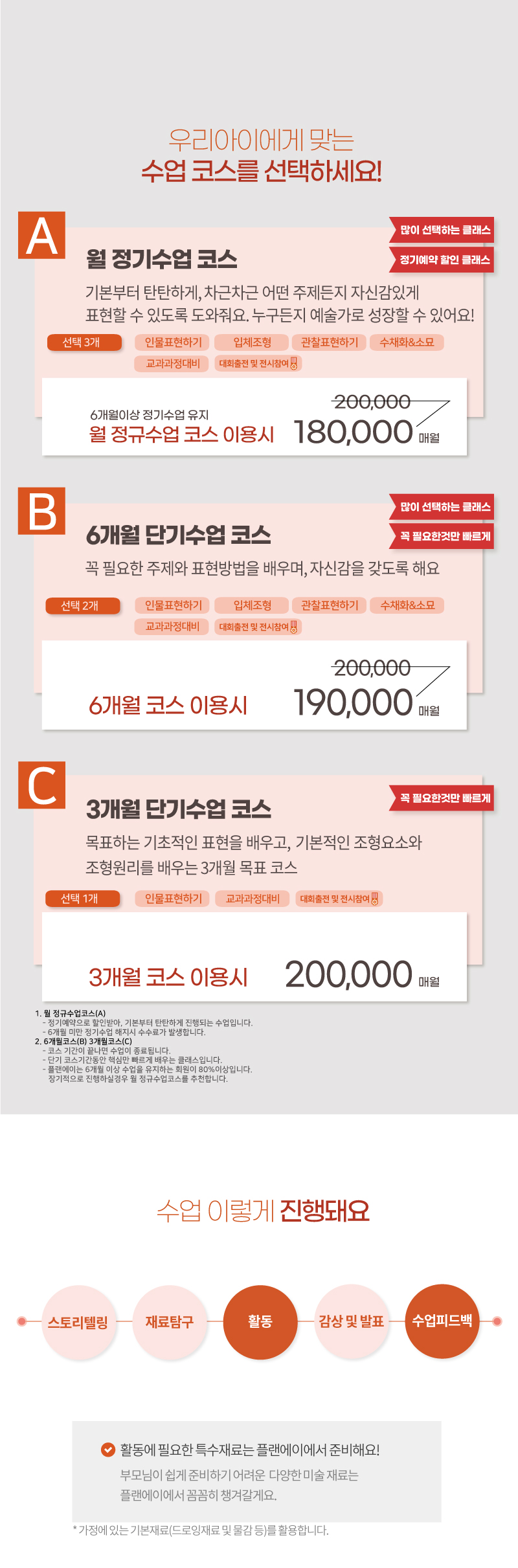 **** 월 정기 결제 서비스 해지를 원한다면 최소 월 정기 결제 서비스 종료일  1주일 전 영업시간 내 [고객센터] 070-4211-8099 또는 1:1채팅[카카오톡채널]을 통해 서비스 해지가 가능합니다. 1주일전 내 해지 요청시 다음 회차에 대한 수업 정상 진행으로 판단 후 수업 설계 및 재료 준비를 진행하기 때문에 1회차(4회 수업) 결제금액의 10% 수수료가 발생합니다.