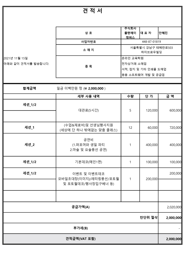 기타 취소 및 환불 규정은 ‘레슨 환불 기준 원칙 학원의 설립/운영 및 과외교습에 관한 법률 제 18조’에 따릅니다.