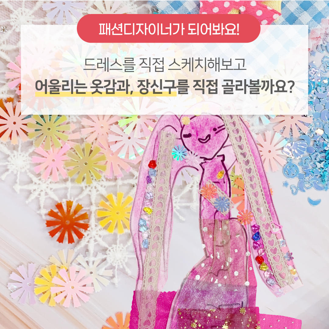 드레스를 직접 스케치해보고 어울리는 알록달록 옷감과 장신구를 직접 골라보며 수석디자이너가 되어보는 경험을 해볼까요?