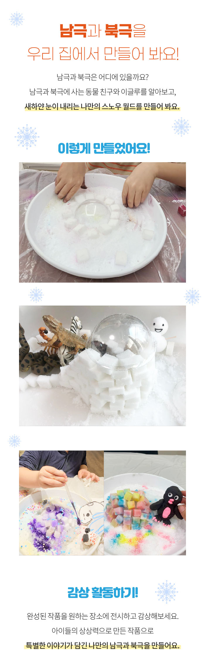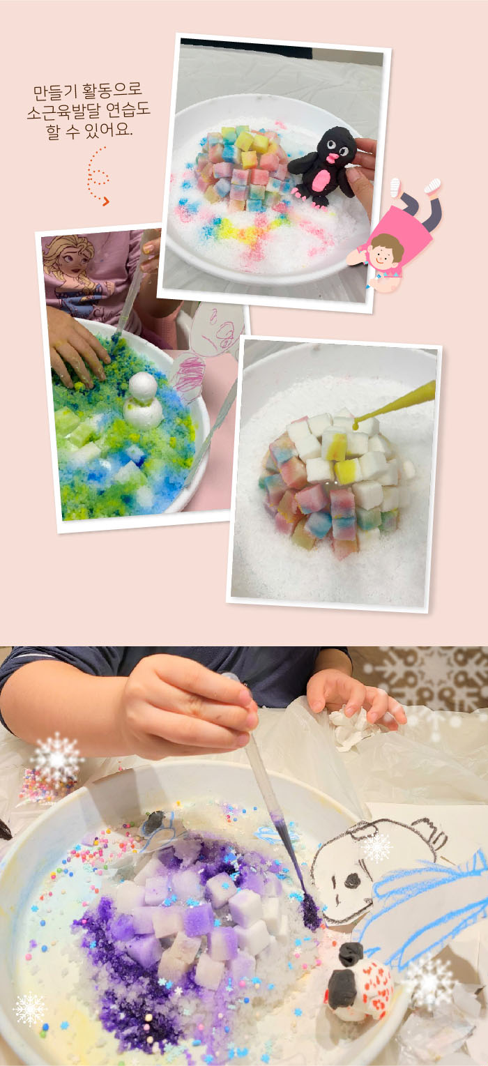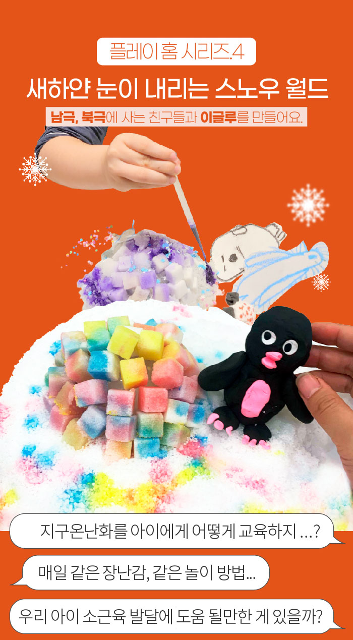 새하얀 눈이 내리는 곳엔 어떤 동물 친구들이 살고 있을까요? 촉감놀이도 즐기고, 소근육 발달 훈련과 지구온난화 학습까지! 쉽고 재밌게 만들며 배워봐요.
