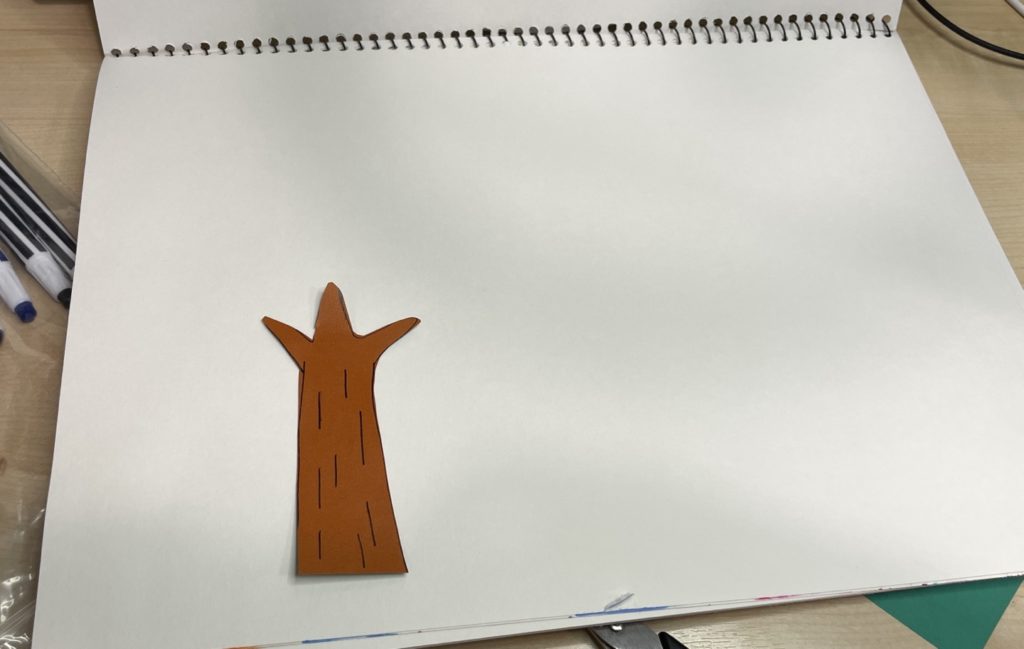 풀을 이용하여 8절 도화지에 나무 기둥을 붙여주세요. 나무의 위치는 학습자가 자유롭게 선택할 수 있도록 해주세요.