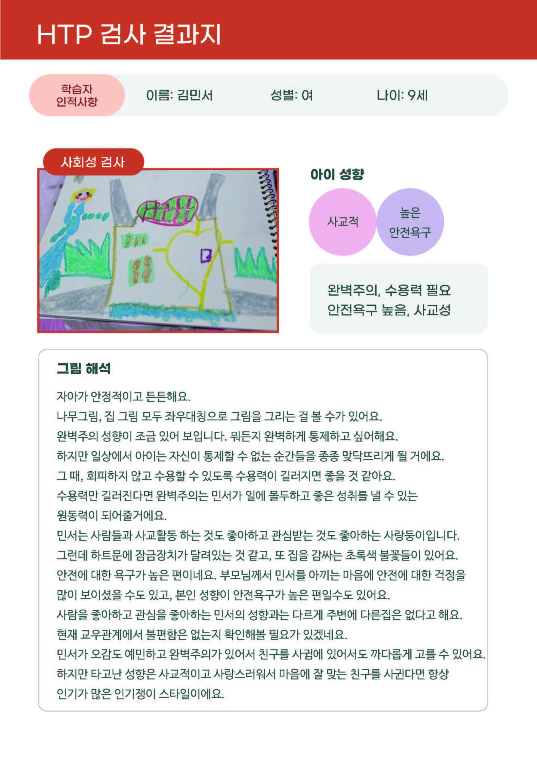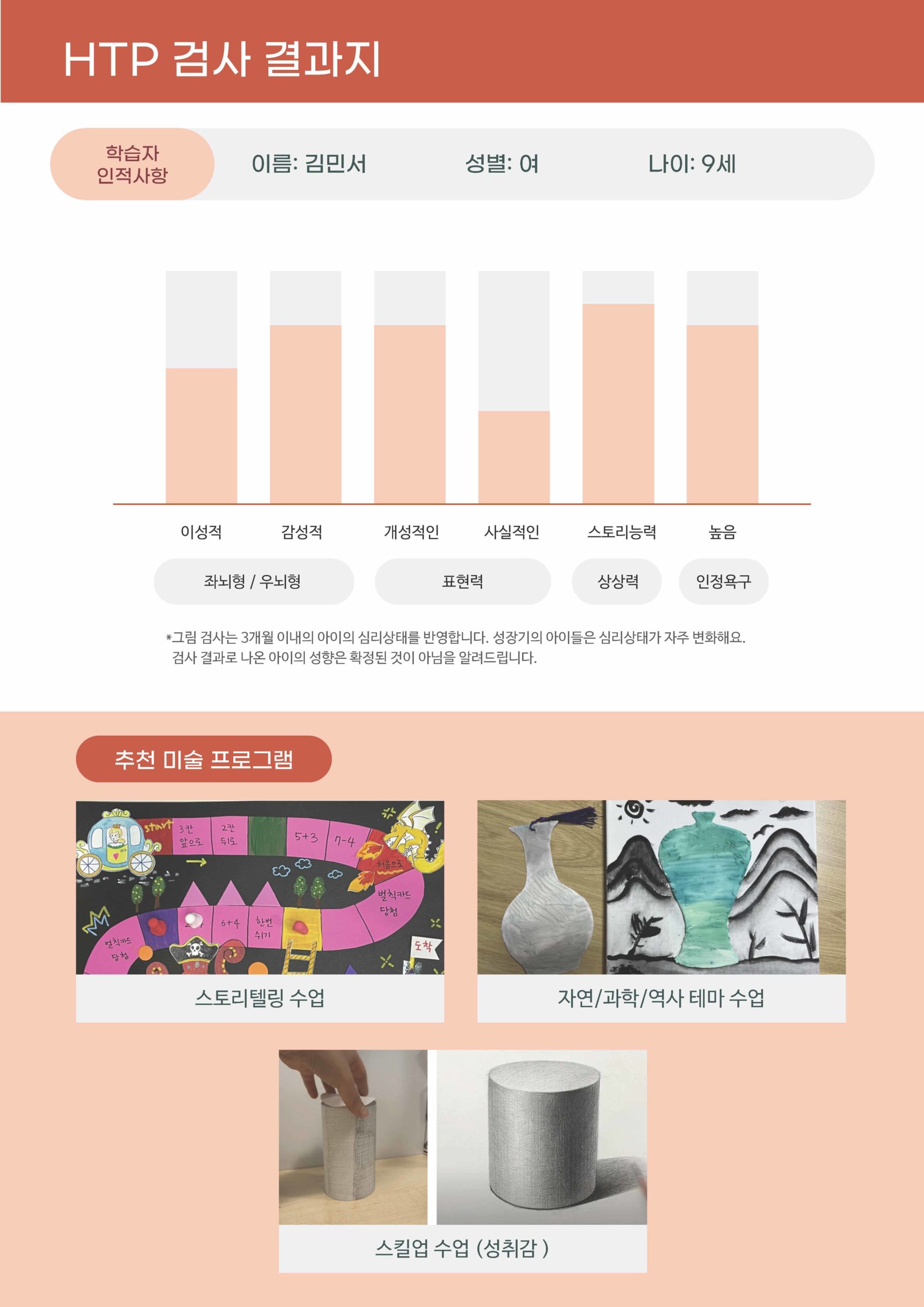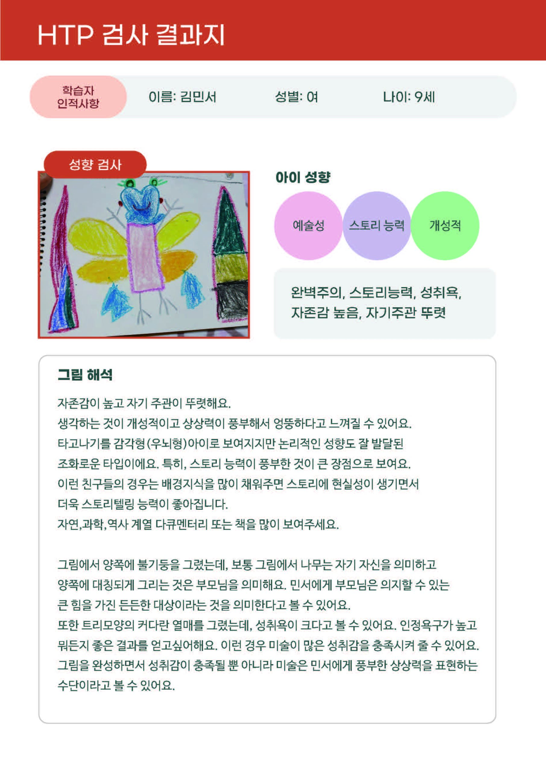 [심리미술] HTP 검사 결과지(김민서) 추천 프로그램 연계 클래스 살펴보기:) [초등학생을위한] 베이직 단계 [시그니처]베이직단계 클래스를 듣고 있는 아이들의 다음 단계를 위해 개발된 추천 프로그램입니다:)레벨업된 스킬 향상으로 성취감을 느끼며 보다 전문성있는 미술 프로그램을 경험하게 됩니다.인정욕구가 높고 좋은 결과를 얻고 싶어하는 아이들에게 추천하는 프로그램입니다. [초등학생을위한] 베이직단계 자세히 보기 > [프리미엄]플래닝 단계 [시그니처]베이직단계 클래스보다 확장된 스토리텔링과 프리미엄 재료가 제공되는 추천 프로그램입니다:)차별화된 스토리텔링과 깊이있는 교육 내용으로 많은 아이들에게 사랑받는 프로그램입니다.스토리텔링이 풍부하고 배움의 깊이를 더하고 싶은 아이들에게 추천하는 프로그램입니다. [프리미엄]플래닝단계 자세히 보기 > 플랜에이캠퍼스2024-01-31T18:31:06+09:00