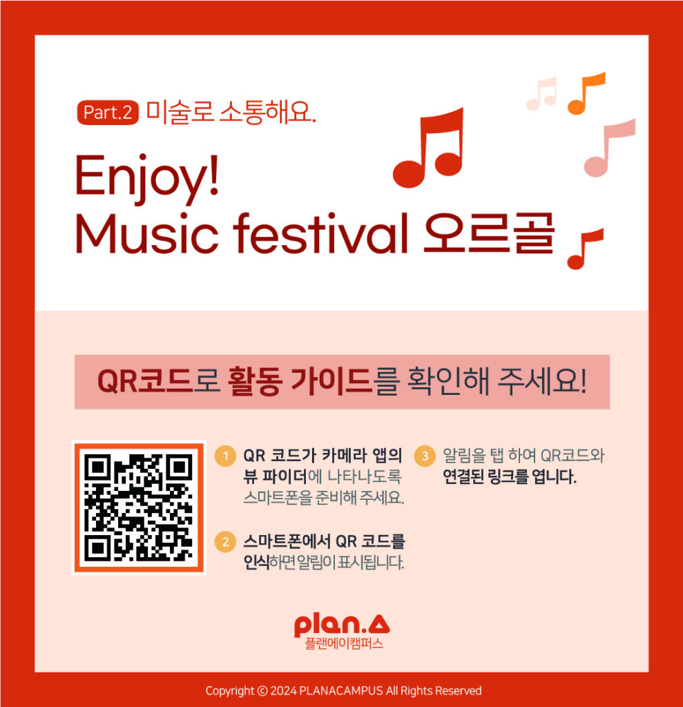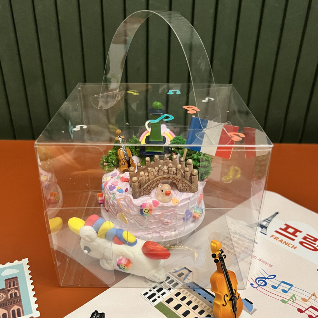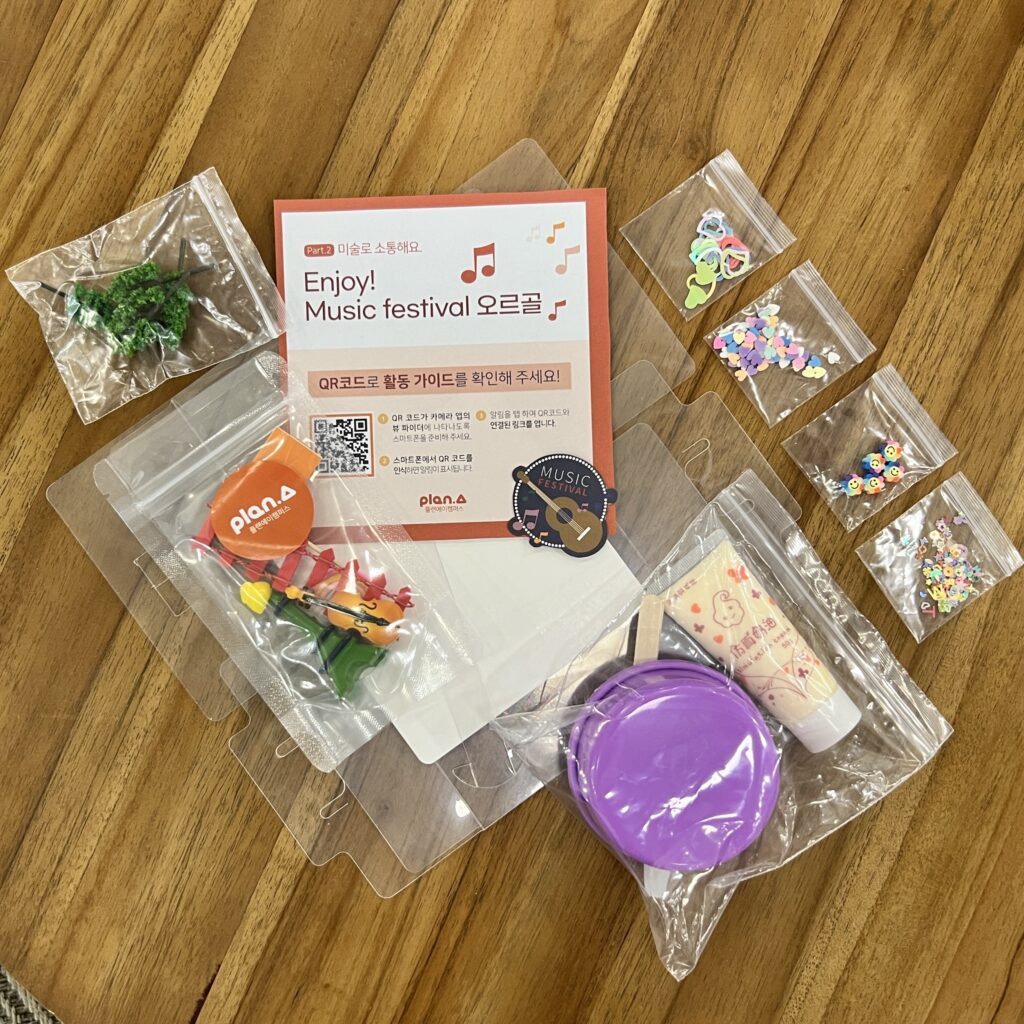 Enjoy! Music festival 오르골 [Part. 2] 미술로 소통해요 - Enjoy! Music festival 오르골 1. 재료준비하기 준비된 재료를 확인해주세요:) 다양한 피규어와 장식재료들은 종류와 색상이 랜덤으로 제공됩니다 🙂 오르골데코덴(+깍지)&하드막대 2개랜드마크피규어(랜덤) 악기피규어(랜덤)울타리&다리 피규어오리 피규어무지개 오너먼트미니어처나무반짝이가루(랜덤모양)반짝이파츠(하트)하트 스프링클스마일 꽃 파츠투명케이스(+행사 로고 오너먼트) 2. 도입 ( 공감하고 상상하기) 아이와 이렇게 이야기를 나눌 수 있어요많은 사람들이 모여있네?이곳에 왜 이렇게 모여있는걸까?조금 더 자세히 살펴볼까? 아이와 이렇게 이야기를 나눌 수 있어요음악소리도 들리고, 춤도 추고 즐거워 보이는구나! 아이와 이렇게 이야기를 나눌 수 있어요많은 사람들이 모여 즐겁게 음악, 춤, 공연, 맛있는 음식까지!이렇게 즐거워 보이는 이유는 지금 이곳에서 신나는 축제가 열리고 있기 때문이란다:)우리도 지금 즐거운 축제를 즐기고 있구나!즐거운 페스티벌의 기분을 아름다운 소리가 나는 오르골 위에 담아볼까? 2. 전개 STEP 1 오르골에 데코덴으로 장식하기 데코덴은 접착력이 있는 생크림 질감이 나는 장식재료입니다.데코덴의 생크림 질감을 이용해 오르골을 장식하고 접착제로 사용해주세요하드막대를 이용해 취향에 맞게 장식해봅니다. 깍지를 끼워 데코덴을 짜면 모양을 만들 수 있습니다.데코덴은 마르는데 시간이 오래 걸립니다. 데코덴은 계절에 따라 질감의 차이가 있을 수 있습니다. 뻑뻑한 질감을 갖고 있는 경우 손으로 잘 주물러주거나 뜨거운 물을 살짝 부어 말랑말랑한 질감을 만들어 주세요 STEP 2 페스티벌이 열리고 있어요! 다양한 장식에 필요한 피규어들을 활용해 나만의 페스티벌을 만들어 봅니다.어떤 음악이 들리고 있을까요?어떤 장소에서 페스티벌이 열리고 있을까요?보호자와 이야기를 나누며 장식재료들로 장식하기 위한 방법을 구성하고 생각해봅니다.다양한 피규어의 위치를 아이와 함께 생각해주세요! 부피가 큰 피규어부터 뒤에 넣고 작은 피규어들을 앞으로 배치하면 예뻐요! ex) 울타리를 제일 뒤에 배치해볼까요? 작품을 완성하면 11cmx11cmx11cm 투명케이스에 넣어 보관하게 됩니다 🙂 작품이 너무 높으면 케이스에 들어가지 않아요 주의해주세요! 다양한 종류의 파츠들을 뿌리거나 원하는 위치에 붙여 장식해보세요 STEP 3 투명케이스에 넣어 보관하기 데코덴은 마르는 시간이 걸려요, 오르골 바닥에 데코덴을 발라 접착제처럼 활용하여 투명케이스에 넣고 고정시켜주세요 STEP 4 커스텀 오너먼트으로 오르골 위에 장식하기 오늘 서페 in 서초구립도서관, THE MUSIC LIBRARY에서 즐거우셨나요?오늘의 추억을 기억하기 위해 제작된 커스텀 오너먼트를 오르골위에 올려 세우거나, 투명케이스에 장식해볼까요? STEP 5 Enjoy! Music festival 완성하기 나만의 페스티벌의 즐거움을 오르골 위에 마음껏 담아냈나요?다양한 장식재료 중 원하는 재료들을 모두 사용했는지 살펴보고, 장식을 마무리 합니다. 3. 감상&마무리 완성된 작품을 아이와 함께 감상해봅니다.오르골를 돌려 아름다운 음악 소리를 들으며 눈과 귀, 마음으로 감상해봅니다. 플랜에이캠퍼스2024-09-26T11:10:00+09:00