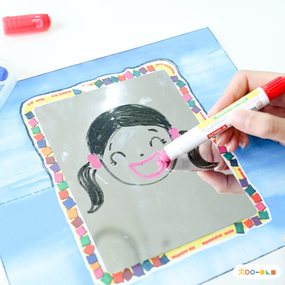 - 아크릴 물감, 포스터 물감 등 거울 위에 사용하기 알맞은 채색재료를 이용하여 색칠해주세요.