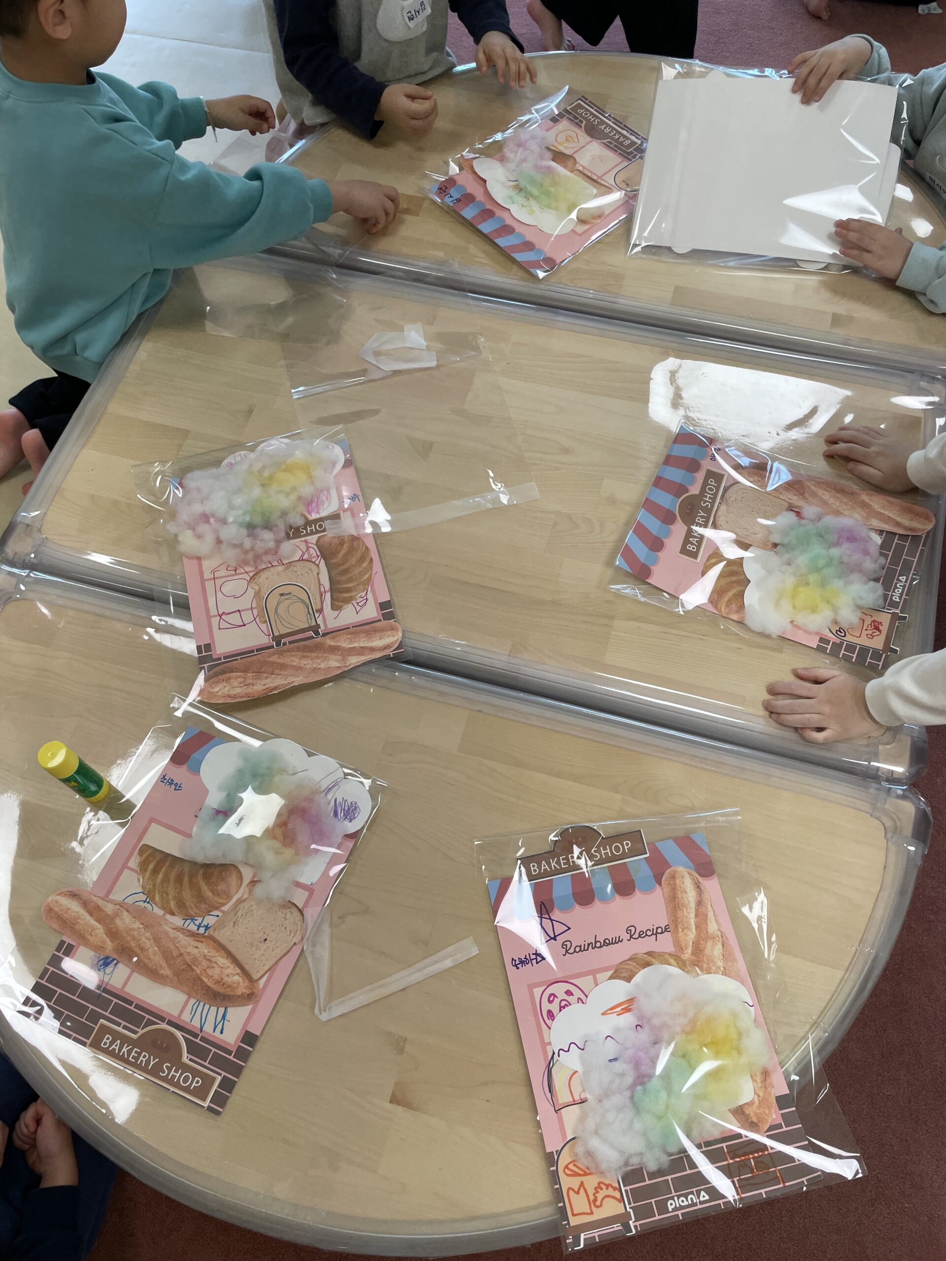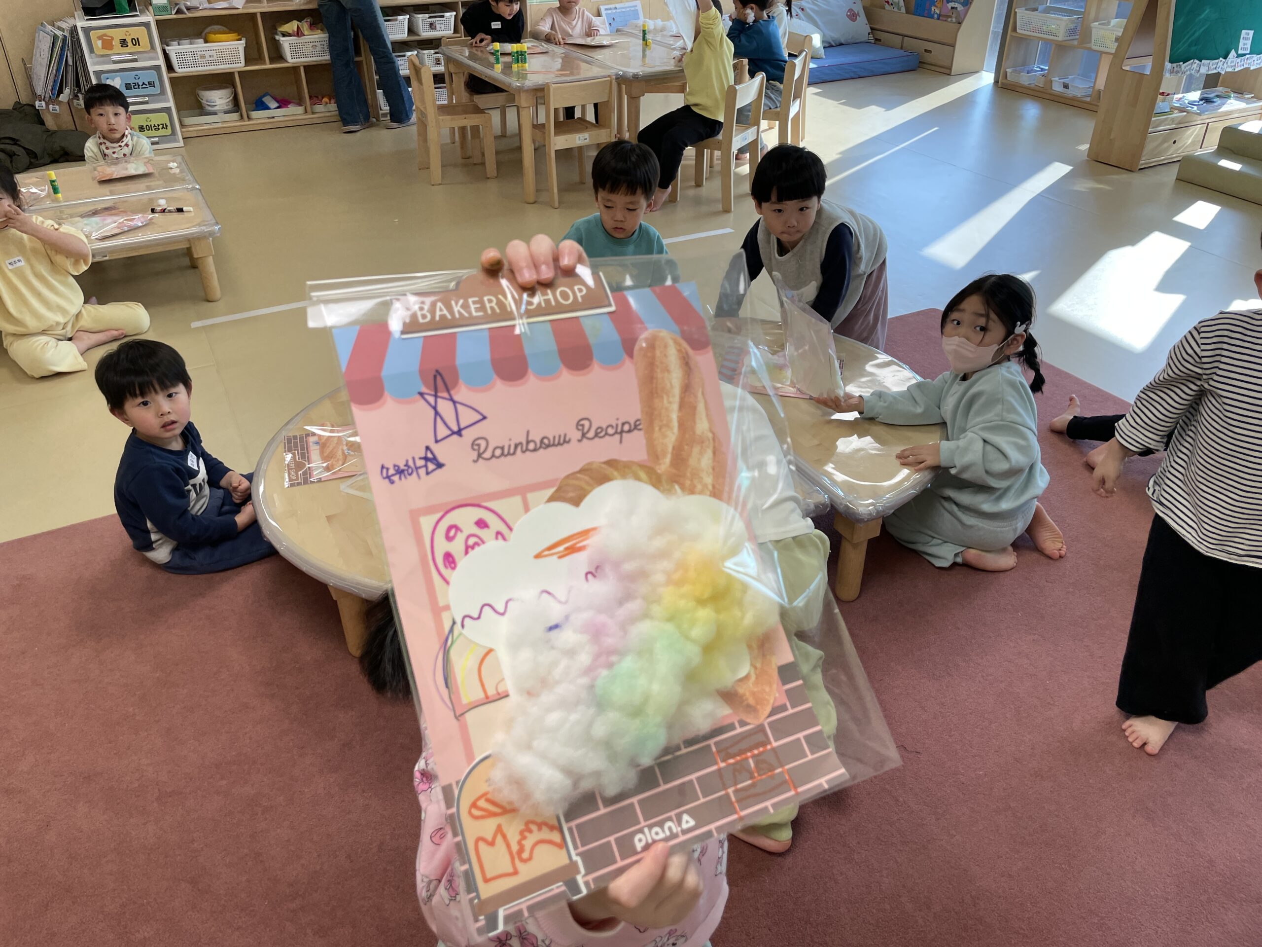 저는 수업시간이 짧아서 여벌도화지 말고 배경지에 빵 그라고 했어요~~