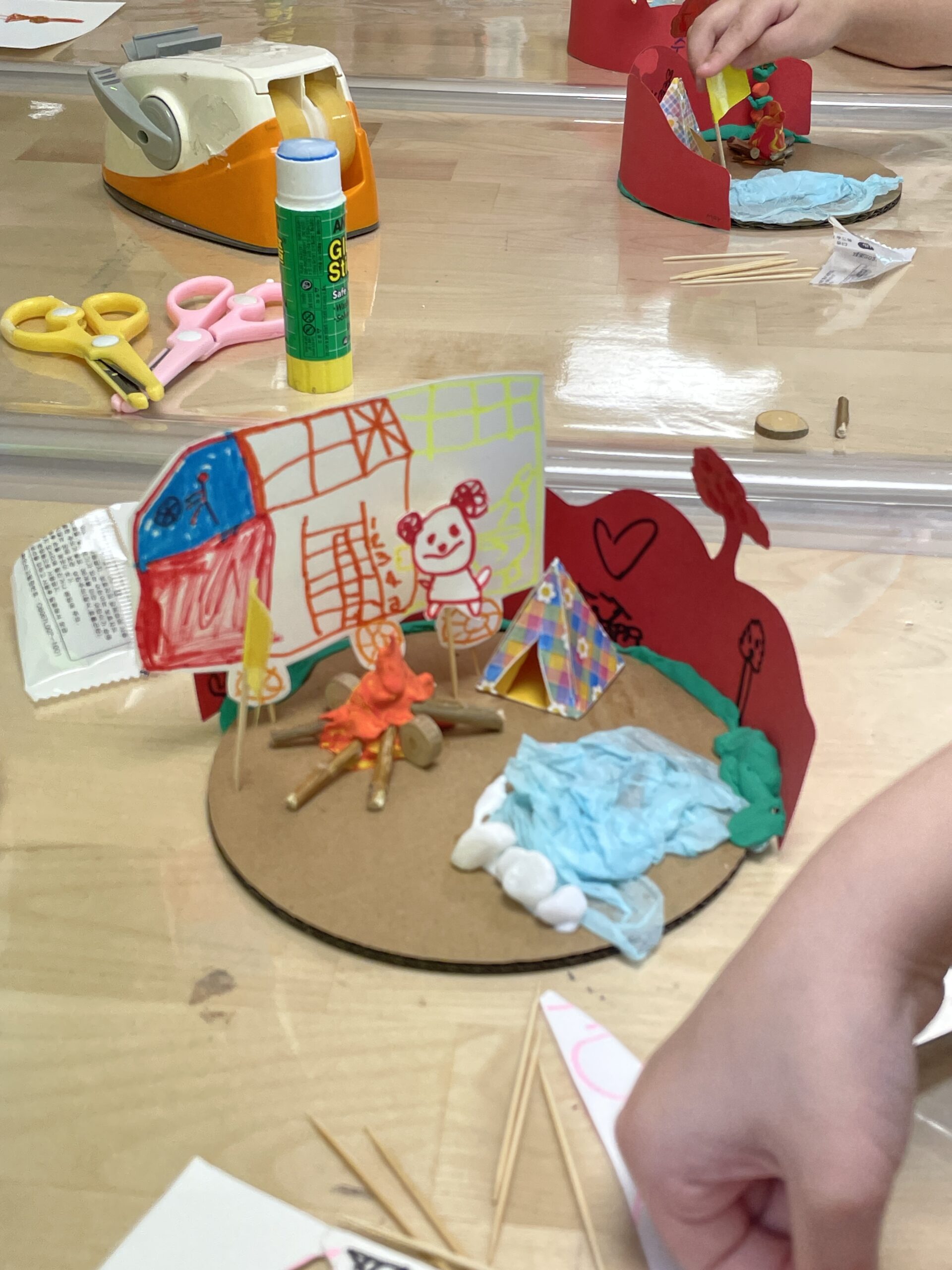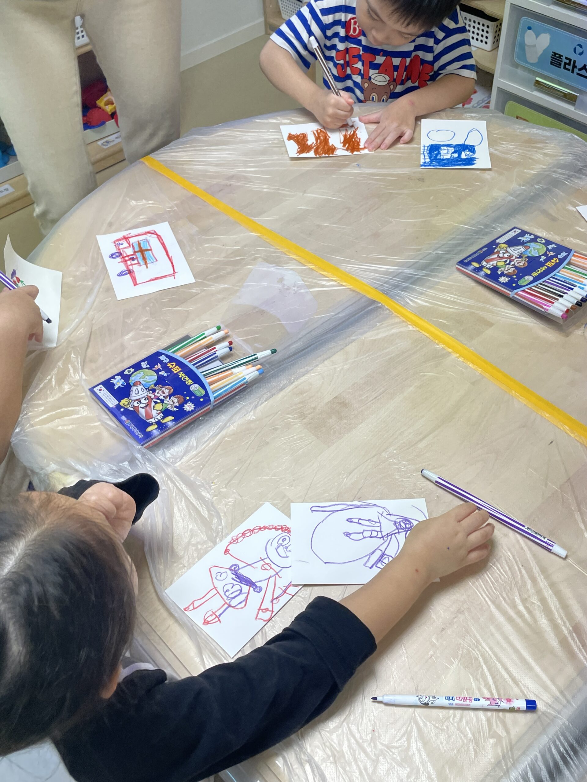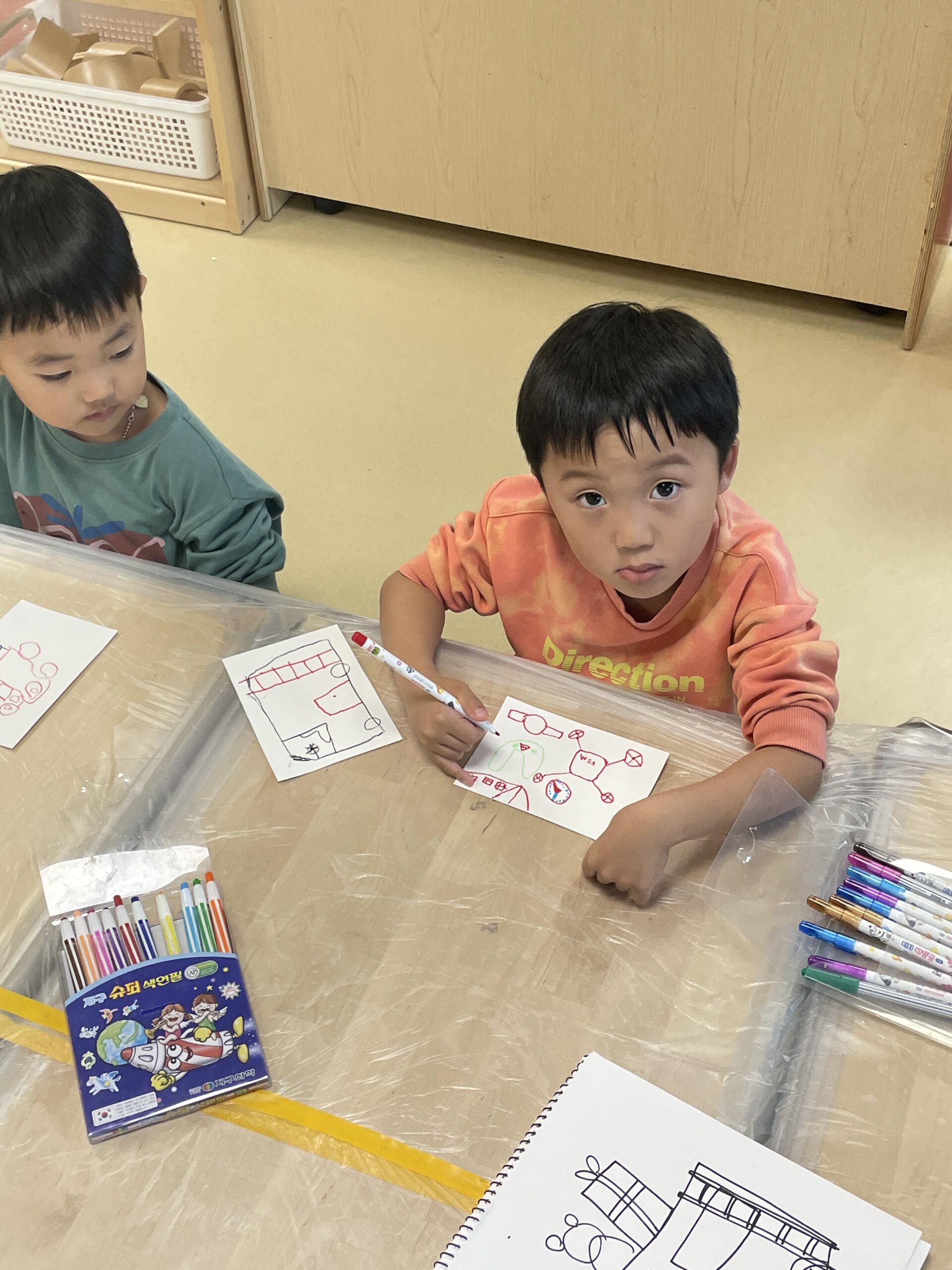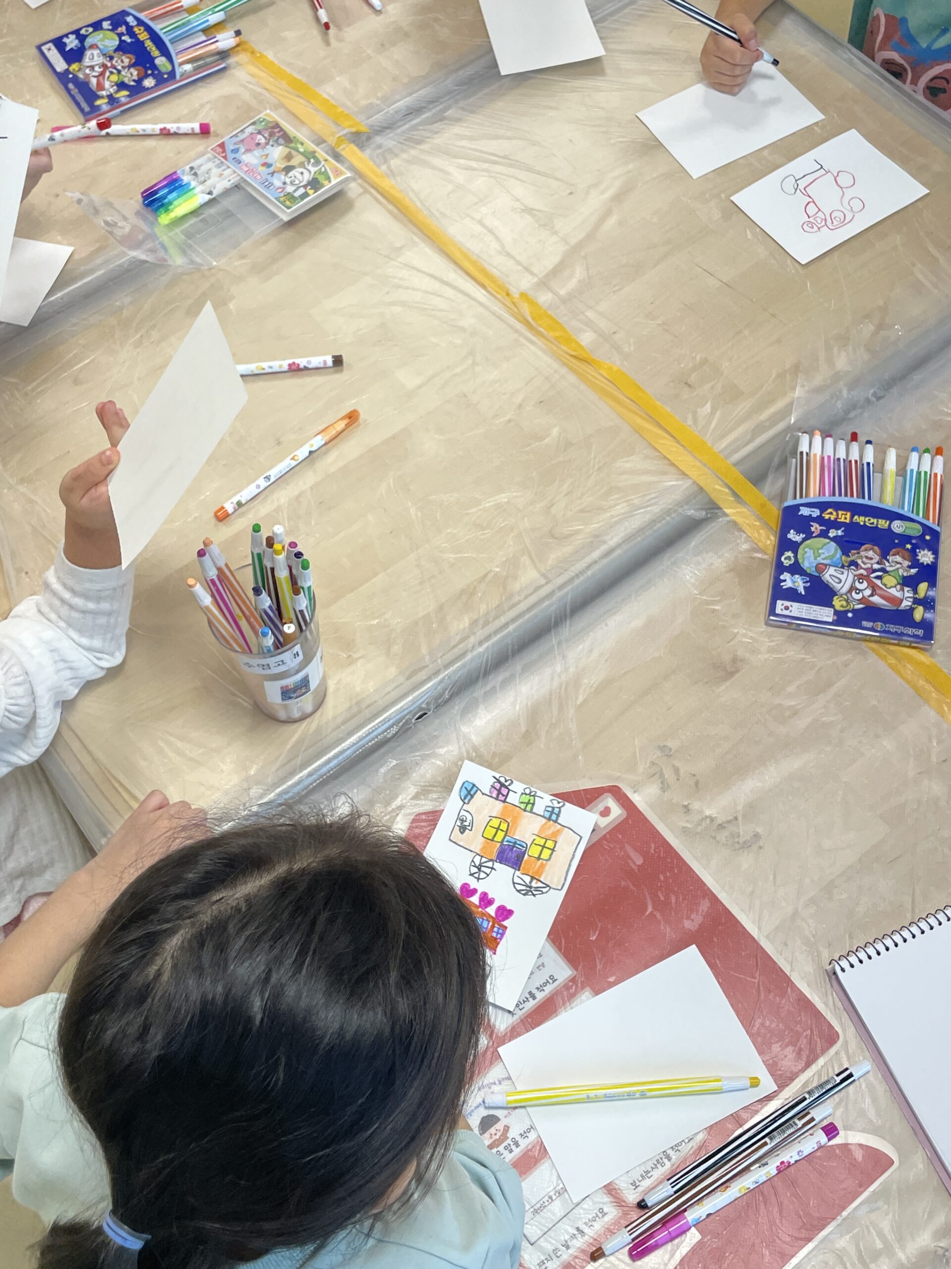 스케치북으로 텐트그리기, 캠핑카 그리는거 보여줬어요. 6세는 거의 캠핑카 그리더라구요. 드론 그리는 아이도 있고 재미있는 그림이 많았어요:)